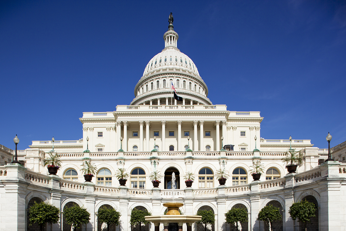 Low angle view of U.S. Capitol Building on spring afternoon, Washington, DC.