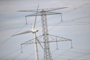 DWIGHT, IL – JUNE 14: Power lines and power generating windmills rise above the rural landscape on June 14, 2018 near Dwight, Illinois. Driven by falling costs, global spending on renewable energy sources like wind and solar is now outpacing investment in electricity from fossil fuels and nuclear power. (Photo by Scott Olson/Getty Images)