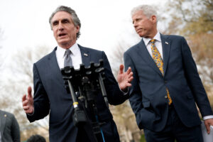 WASHINGTON, DC – MARCH 19: Interior Secretary Doug Burgum (L) and Energy Secretary Chris Wright deliver remarks outside the White House on March 19, 2025 in Washington, DC. President Donald Trump and members of his administration met with a group of oil and gas executives to discuss U.S. energy production. (Photo by Kevin Dietsch/Getty Images)